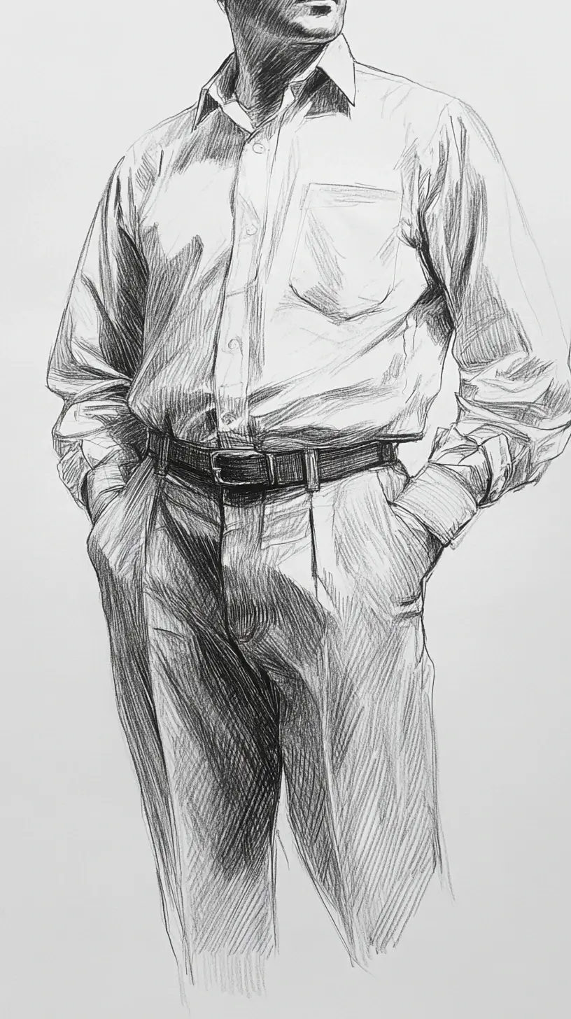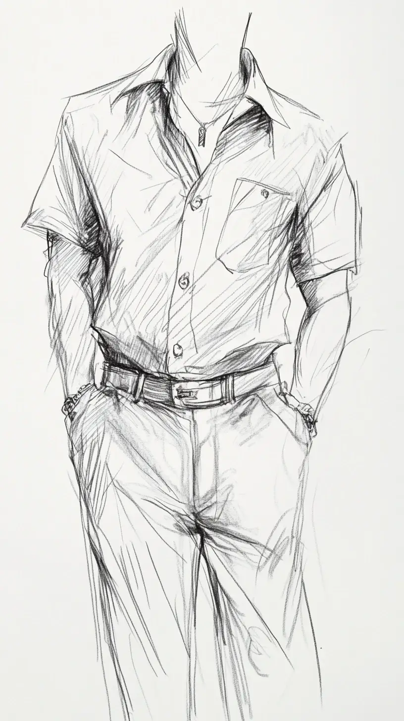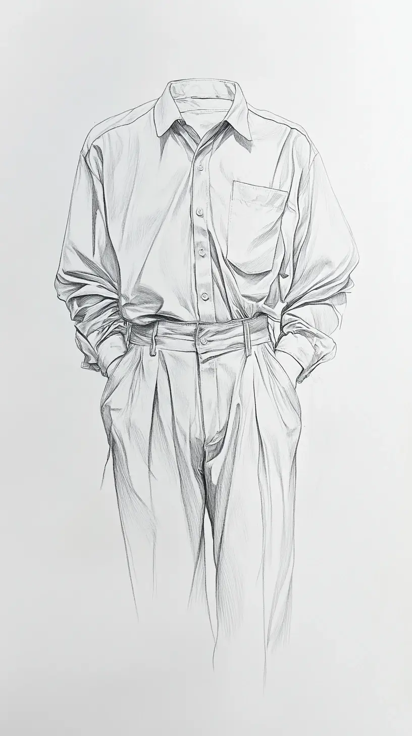 My first step in drawing shirts and tops is to consider the fabric type, as this determines the weight and flow of the garment. For cotton shirts, I depict fewer, softer folds, but for a silk blouse, I include more pronounced drapes. When drawing sleeves, I remember fabrics like denim have less give and thus, fewer but more structured folds.