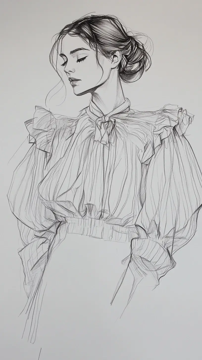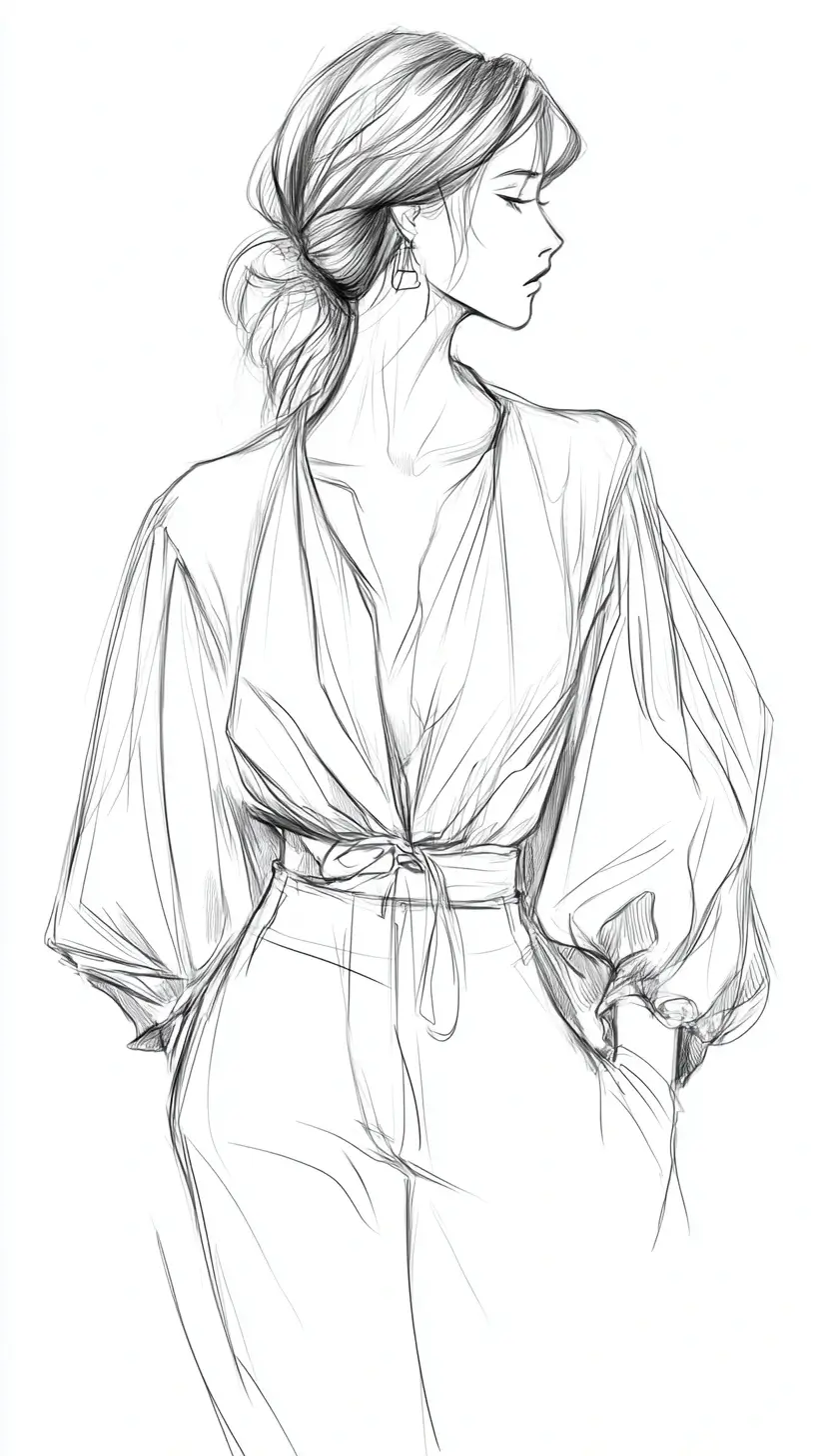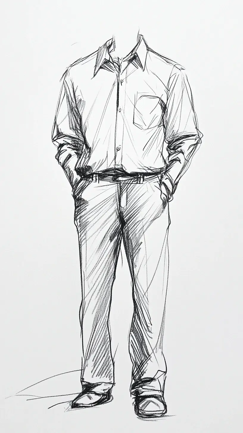 My first step in drawing shirts and tops is to consider the fabric type, as this determines the weight and flow of the garment. For cotton shirts, I depict fewer, softer folds, but for a silk blouse, I include more pronounced drapes. When drawing sleeves, I remember fabrics like denim have less give and thus, fewer but more structured folds.
